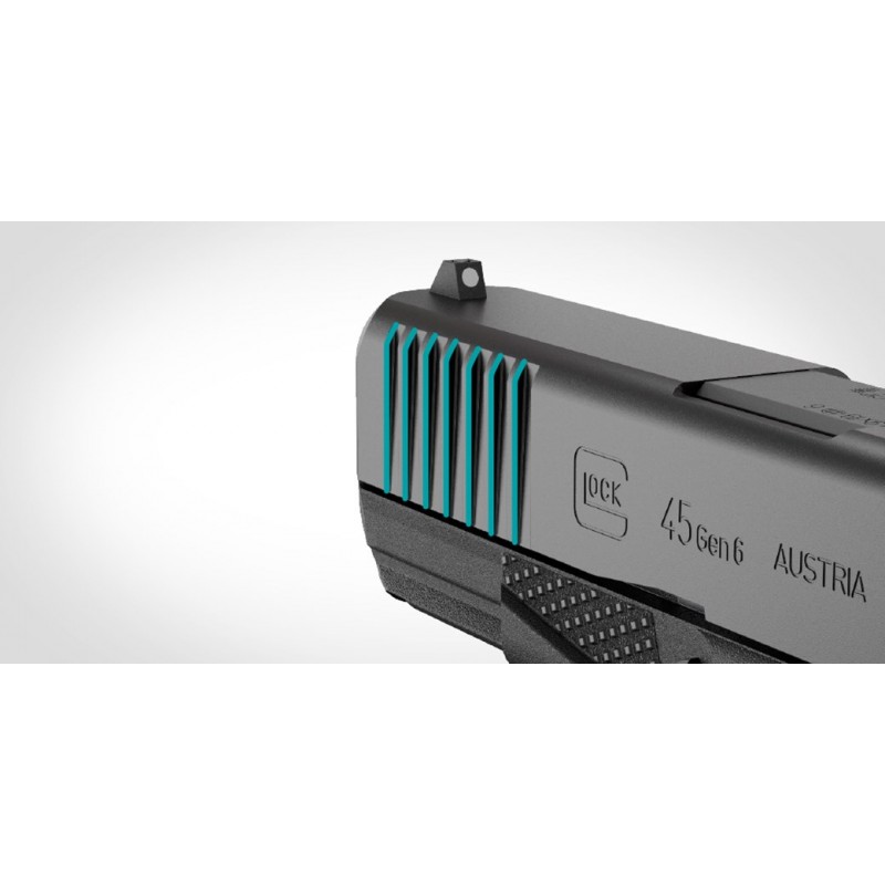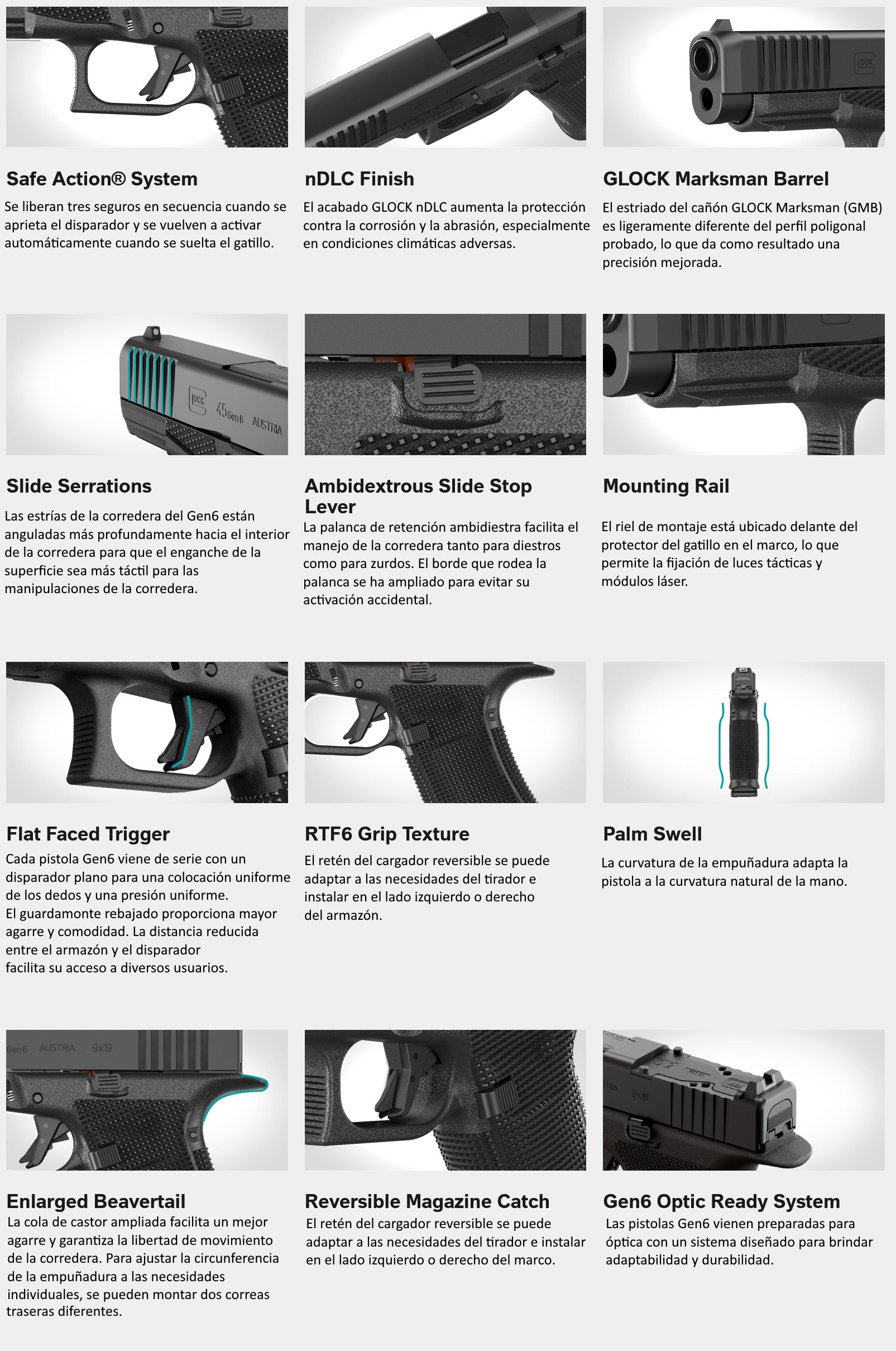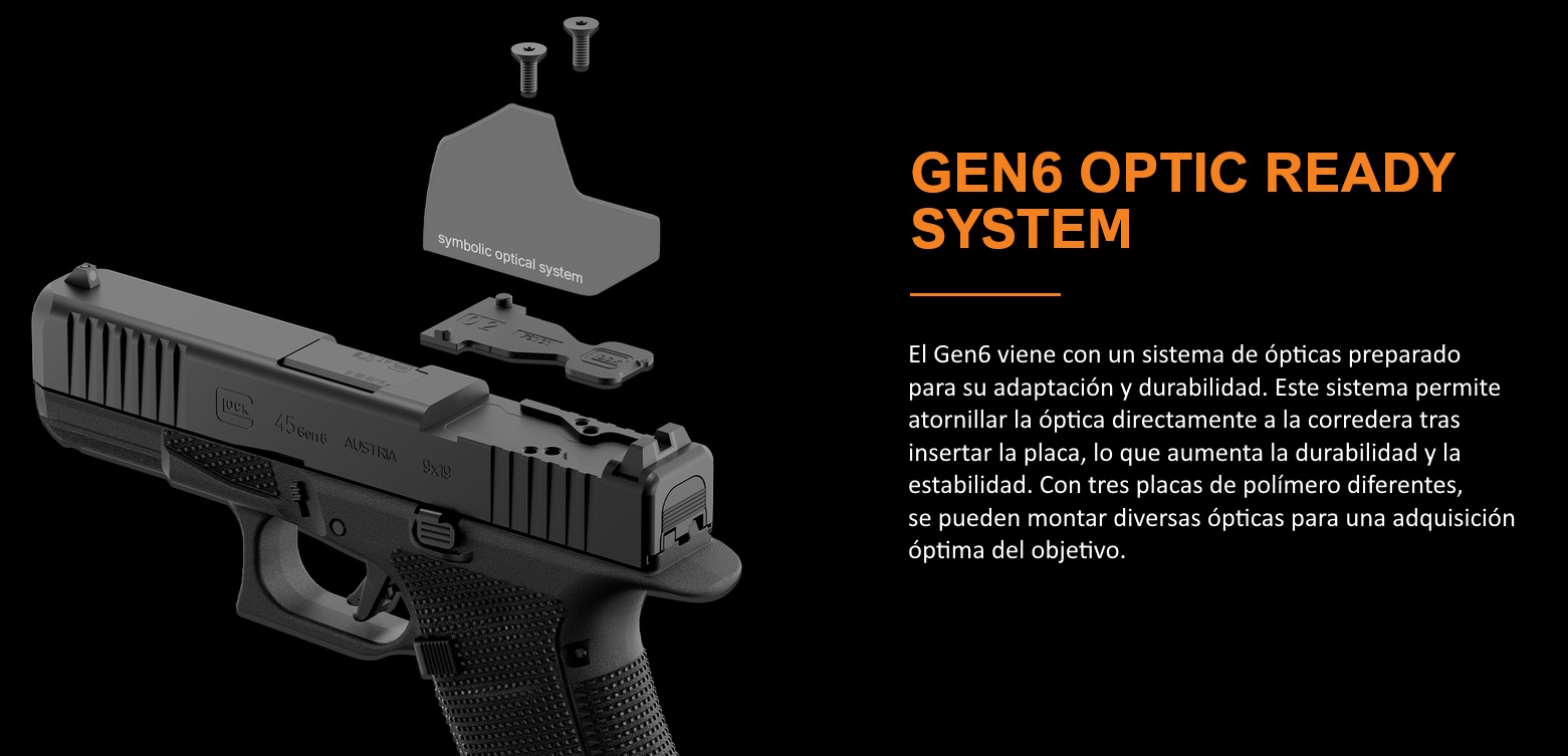 El armazón ergonómico con palma abombada, apoyo para el pulgar y la textura de empuñadura Gen6 se combinan para crear un diseño intuitivo que se ajusta al agarre. Las pistolas Gen6 incluyen un sistema compatible con mira óptica, diseñado para brindar adaptabilidad y durabilidad, e incluyen de serie un gatillo plano para una colocación uniforme de los dedos.