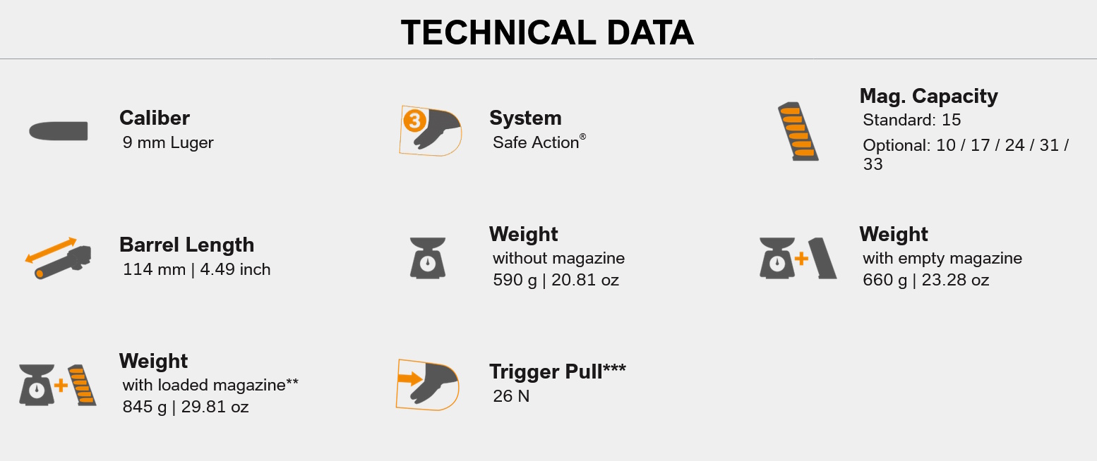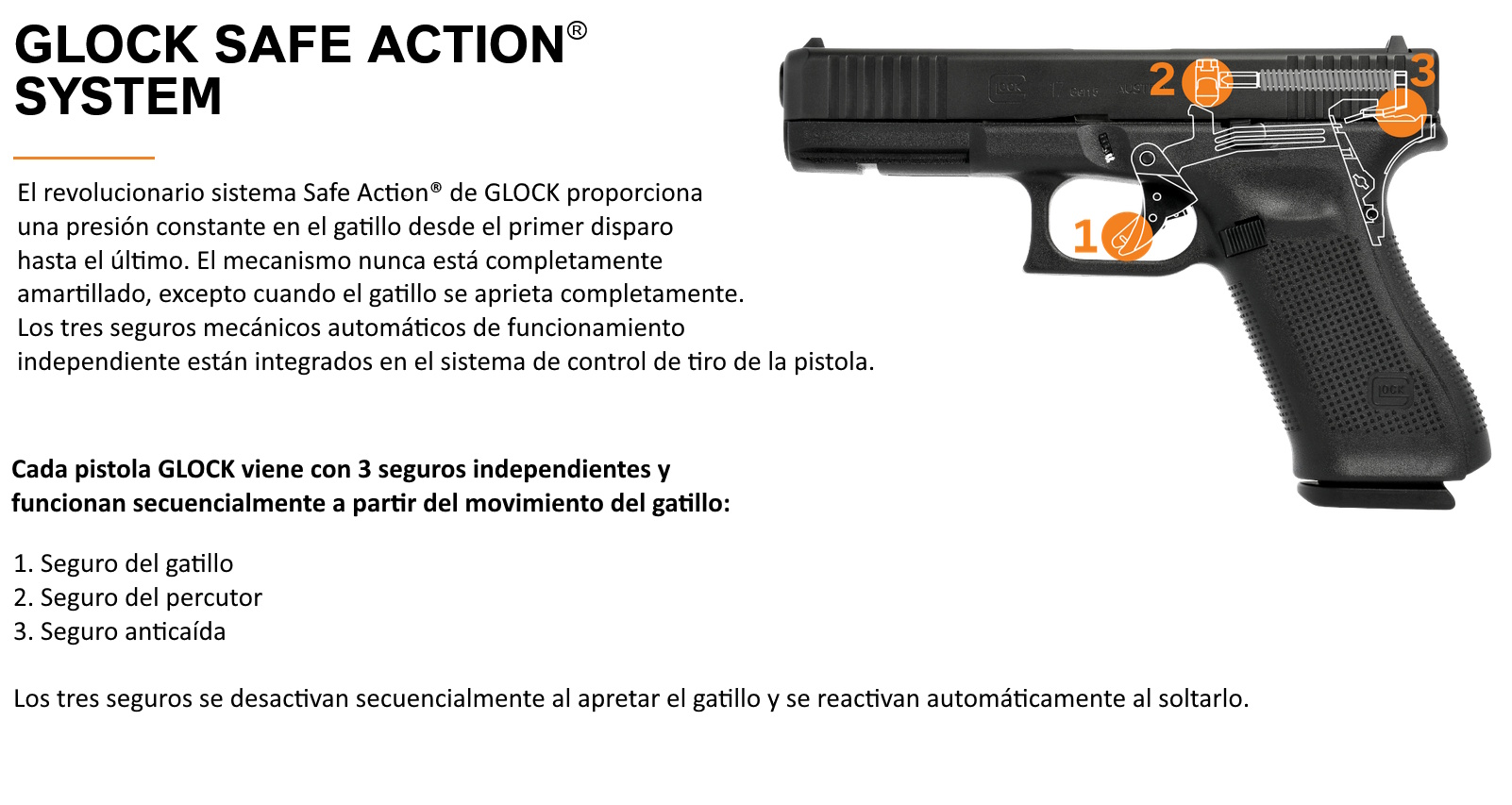 El sistema Safe Action® es un sistema de seguridad completamente automático que consta de tres seguros mecánicos pasivos de funcionamiento independiente. Los tres seguros se desactivan secuencialmente al apretar el gatillo y se reactivan automáticamente al soltarlo.