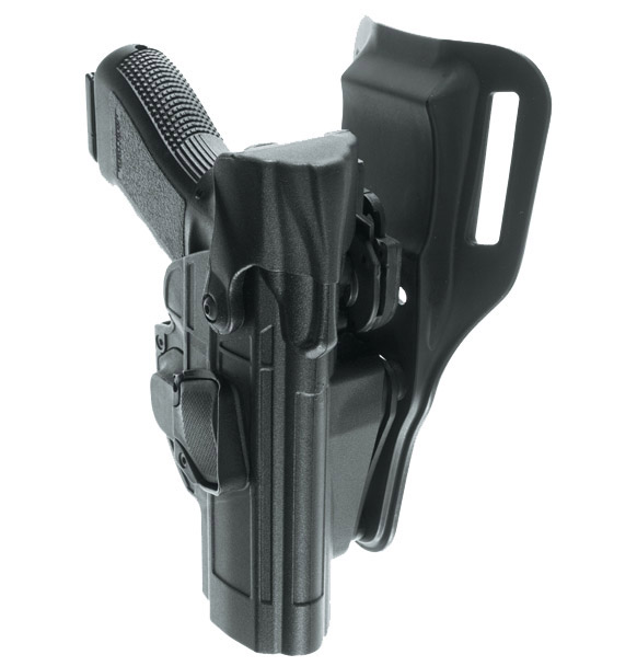 Un sistema rápido y seguro de bloqueo de la capucha de seguridad. Con una simple presión del pulgar en el bloqueo de seguridad SRR, la capucha de seguridad gira automáticamente liberando el arma suavemente, mejorando también la velocidad de extracción.