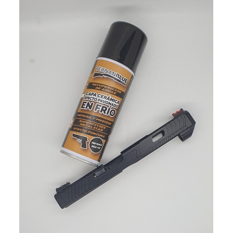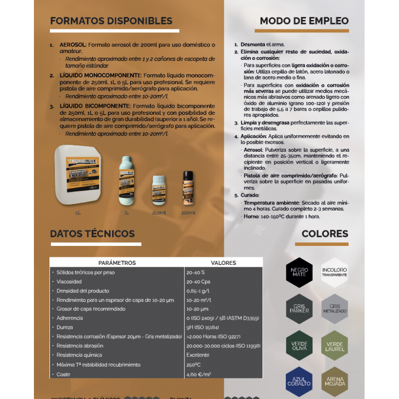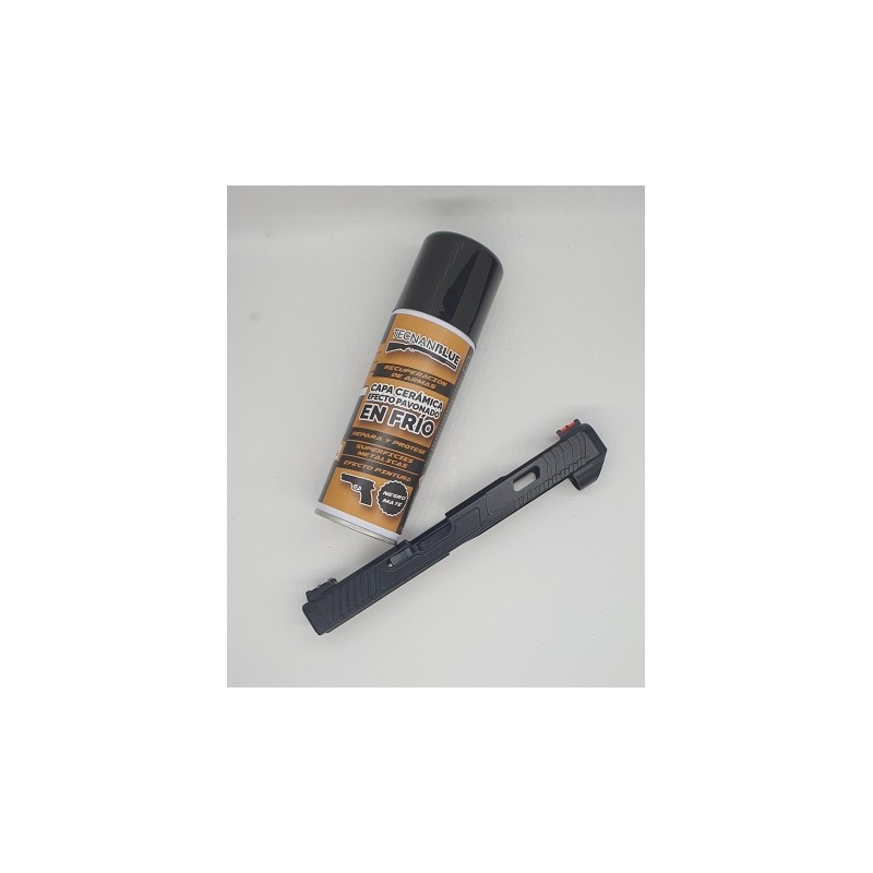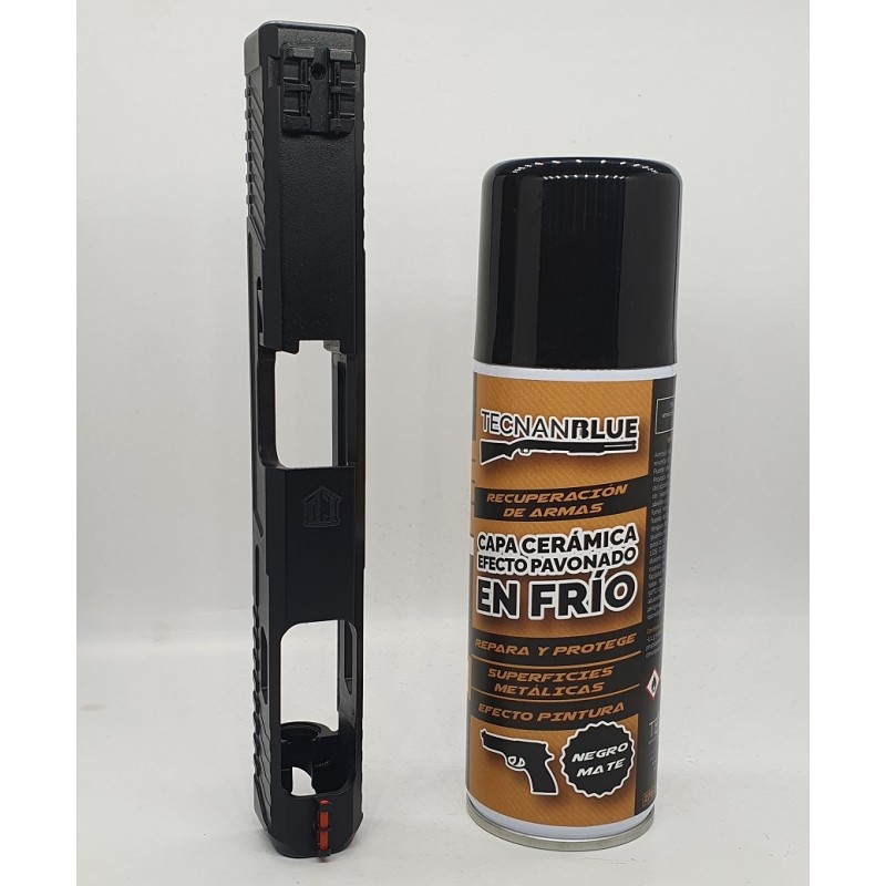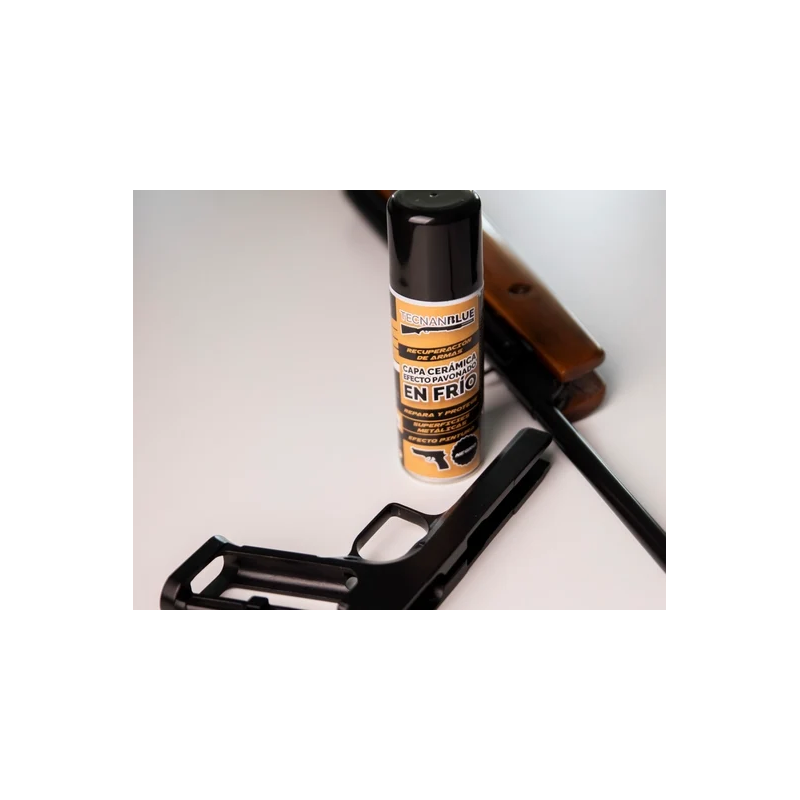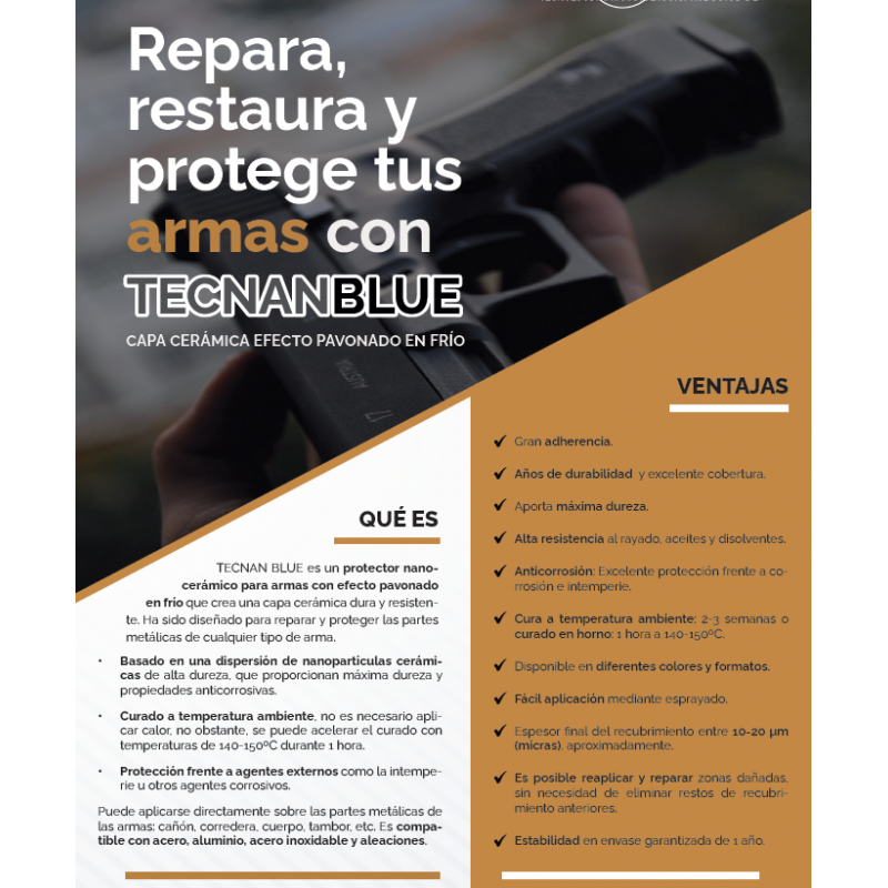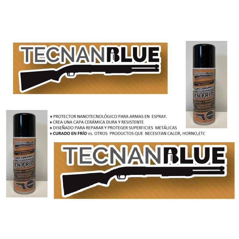 TECNAN BLUE es un protector nanocerámico para armas con efecto pavonado en frío que crea una capa de máxima dureza y alta resistencia a la corrosión, rayado, aceites y disolventes. Ha sido diseñado para reparar y proteger, de forma duradera, las partes metálicas de cualquier tipo de arma: cañón, corredera, cuerpo, tambor, etc. Es compatible con acero, aluminio, acero inoxidable y aleaciones.