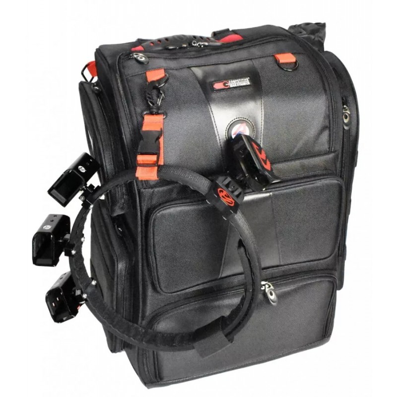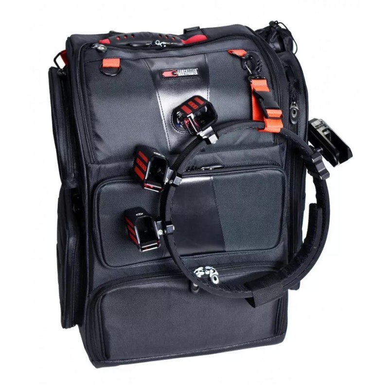 La mochila está diseñada para mantenerse erguida sobre su base impermeable de goma, lo que permite un fácil acceso a todos sus múltiples compartimentos. Comenzando con el gran compartimento superior con cerradura, que incluye un revistero desmontable de 7 bolsillos. Bolsillos adicionales diseñados específicamente para un cepillo magnético, protectores auditivos y una botella de Progrip. Incluso hay un bolsillo diseñado para la caja multiusos de plástico que viene incluida. La tapa estructurada de este compartimento superior incluye un bolsillo con cremallera para documentos, tarjetas de visita y bolígrafos, así como correas elásticas para herramientas y accesorios adicionales.