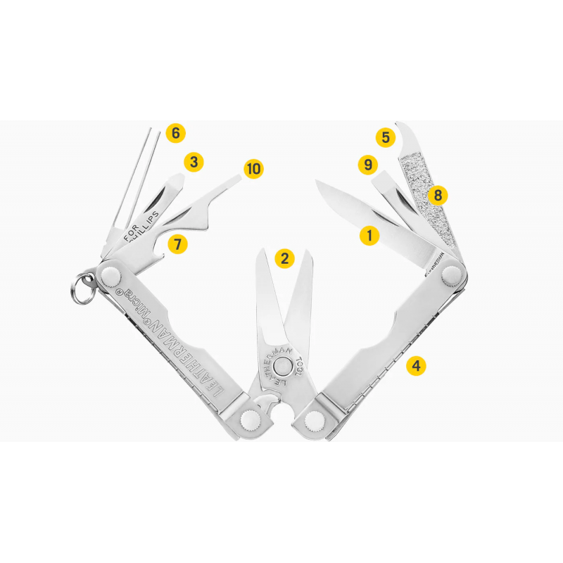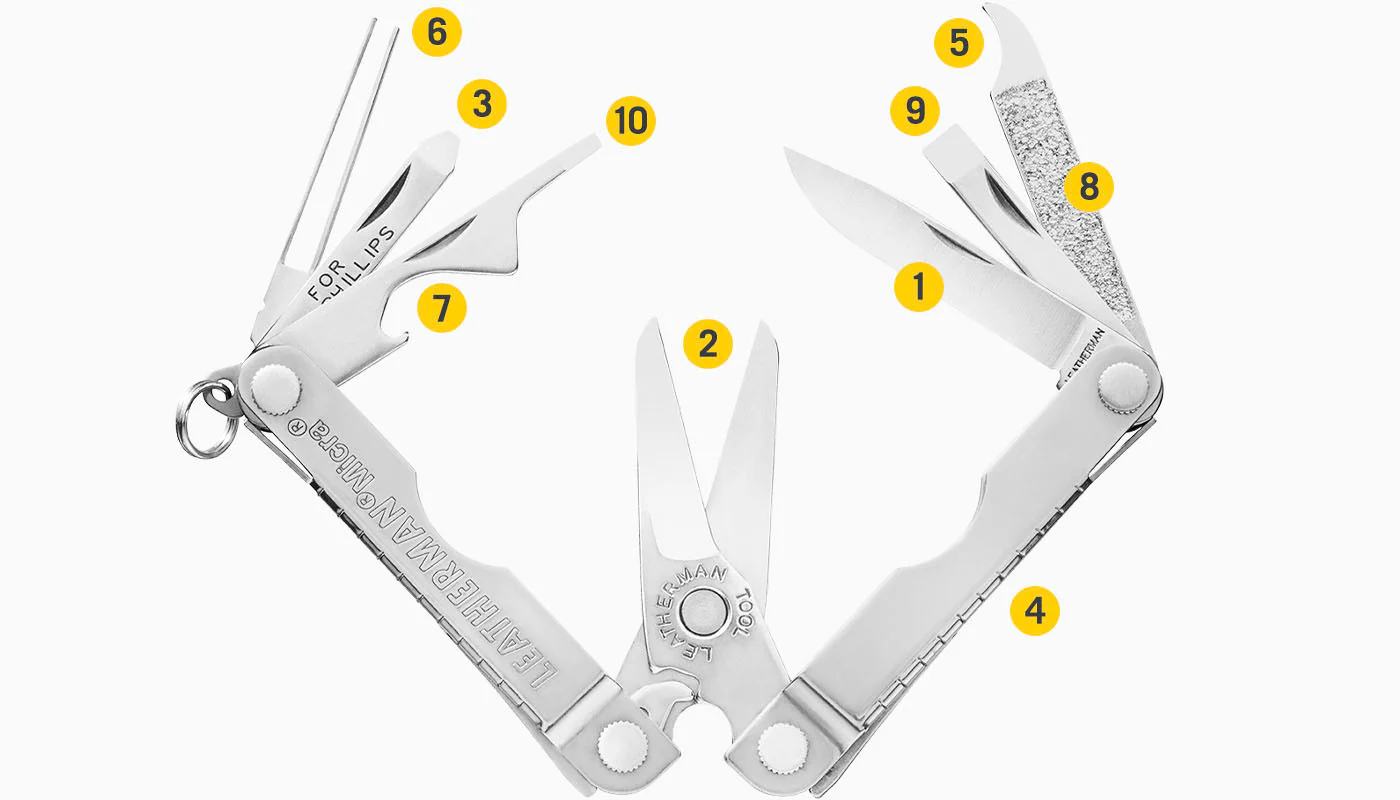 Para estar preparado/a a diario con estilo, adquiere la Leatherman Micra fácil de llevar. Esta multiherramienta compacta se engancha a tu llavero o se desliza en tu bolsillo o bolso. Tijeras de resorte, destornilladores y más para pequeñas tareas como cortar etiquetas, limar uñas o apretar tornillos.