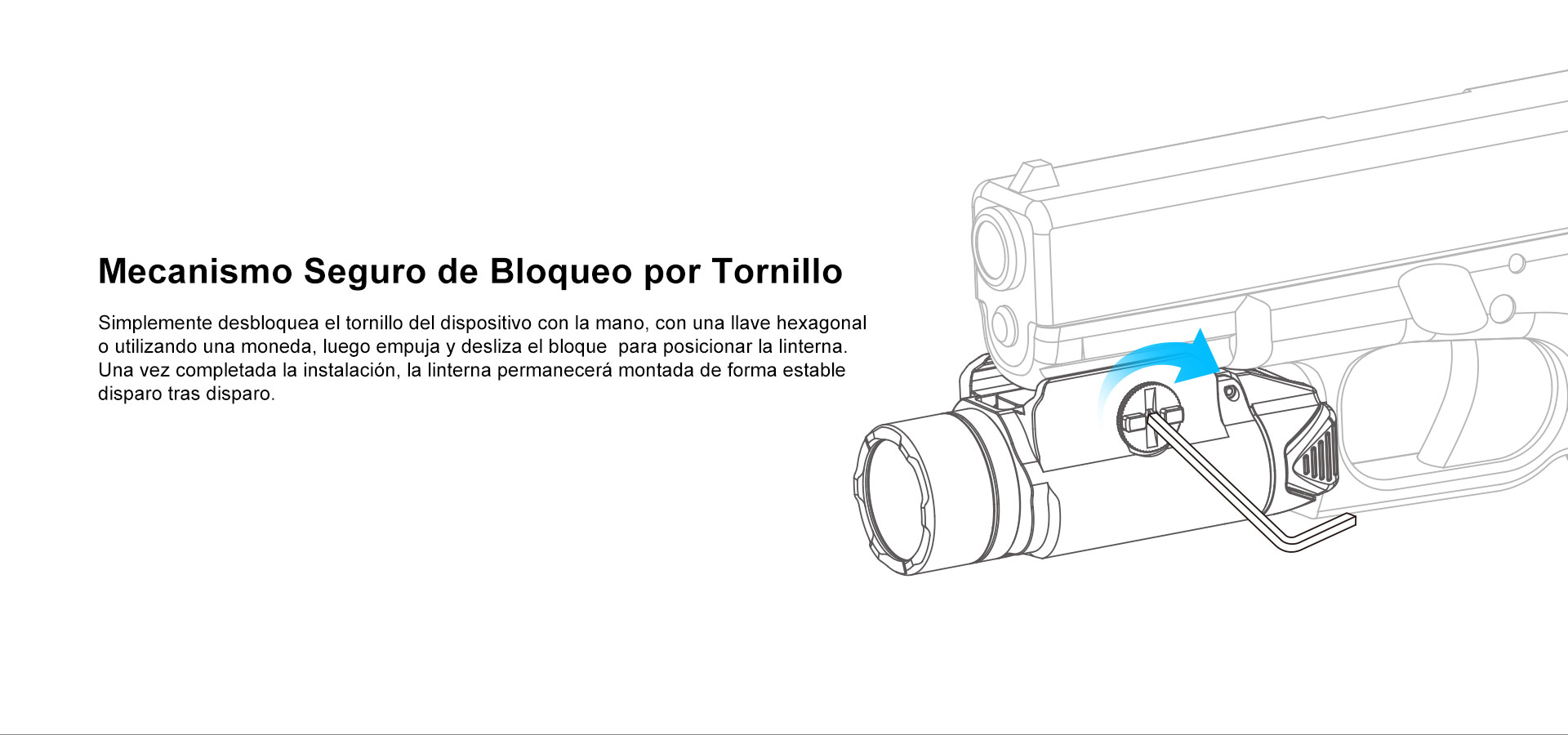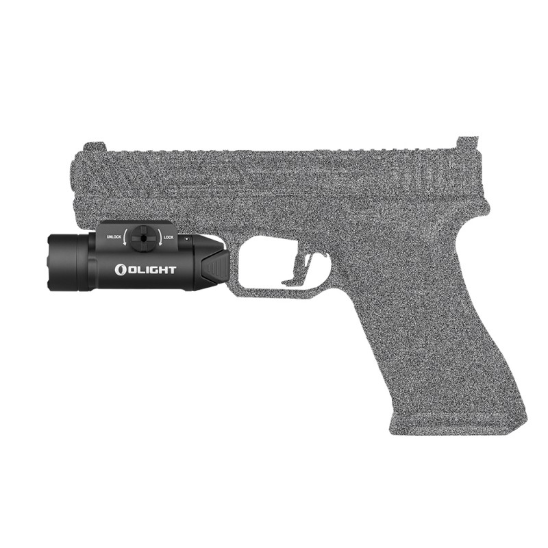Linterna recargable de alta potencia para arma corta con 1.500 lúmenes y 225 metros de alcance. Sistema de bloqueo y carril deslizable y ajustable para hacer compatible su montaje en una amplia gama de armas.